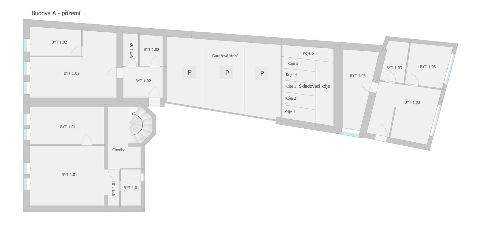 - byt 3+kk o výměře 53,27 m² v budově A přízemí