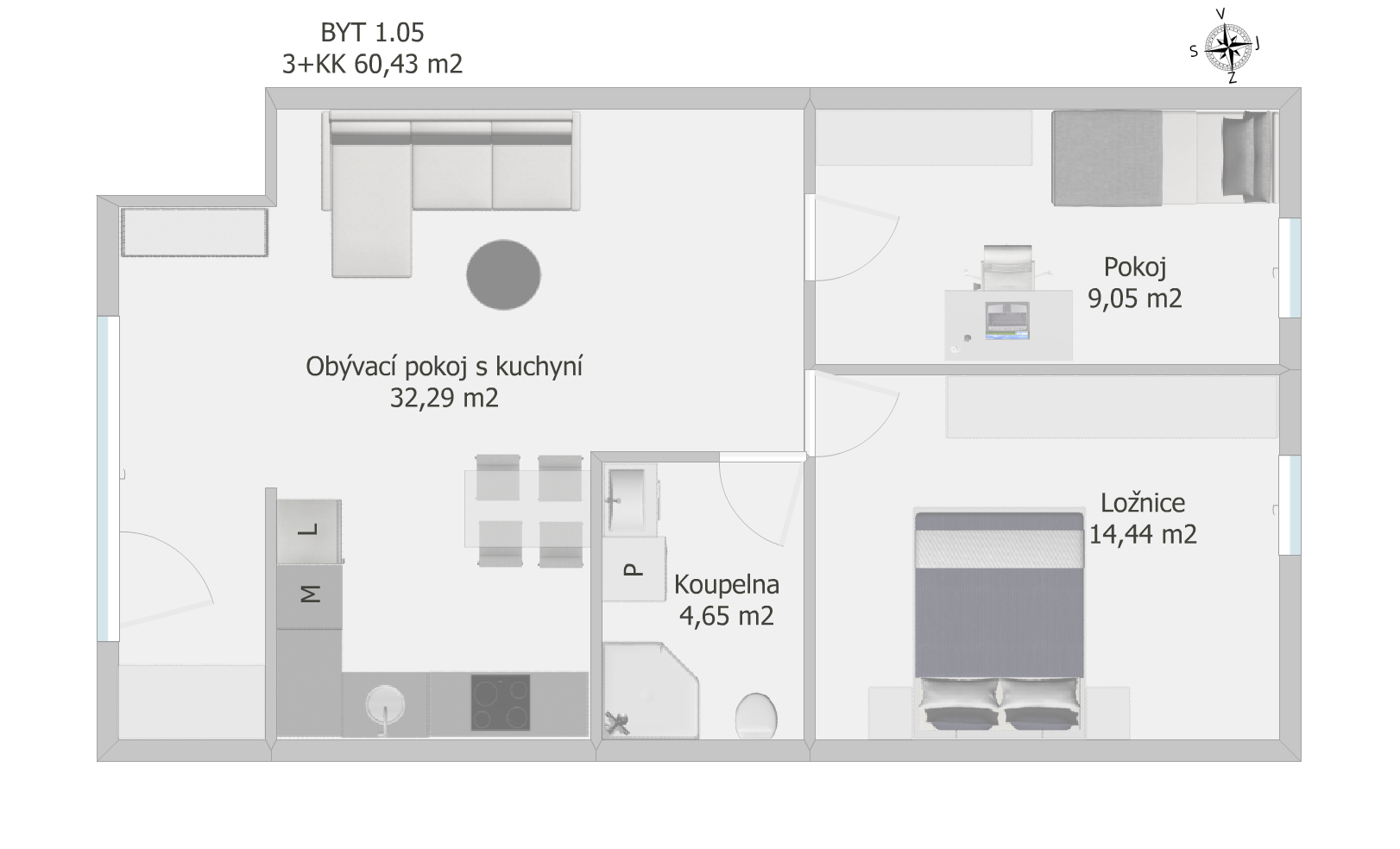 Nabízíme vám ke koupi byt 3+kk č. 1.05 o výměře 60,43 m² s vlastní verandou o velikosti 10,85 m², který vzniká v rámci nového rezidenčního projektu 14 bytů v Plzni – Božkově. Dokončení výstavby je plánováno na 4. čtvrtletí roku 2026.