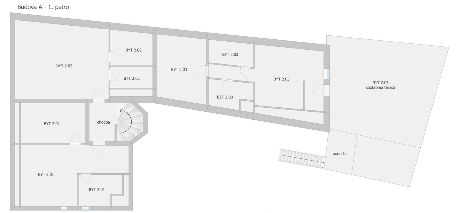 - byt 2+kk o výměře 59,63 m² v budově A 1. patro