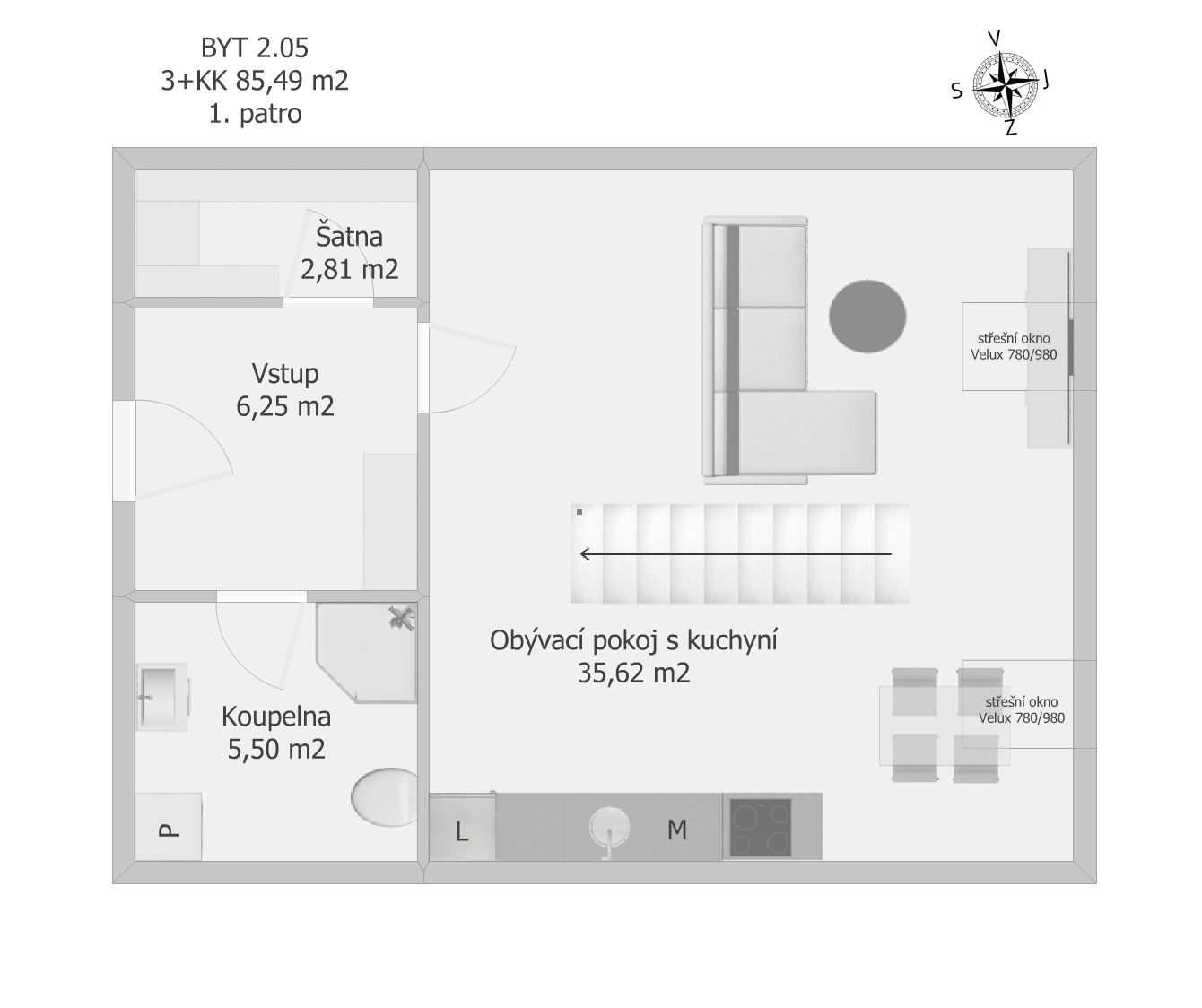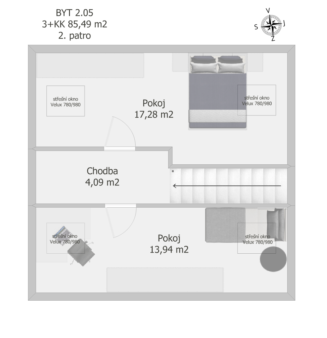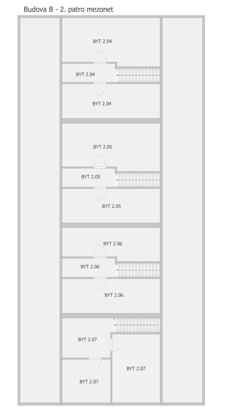 - mezonetový byt 3+kk o výměře 85,49 m² v budově B 1. patro