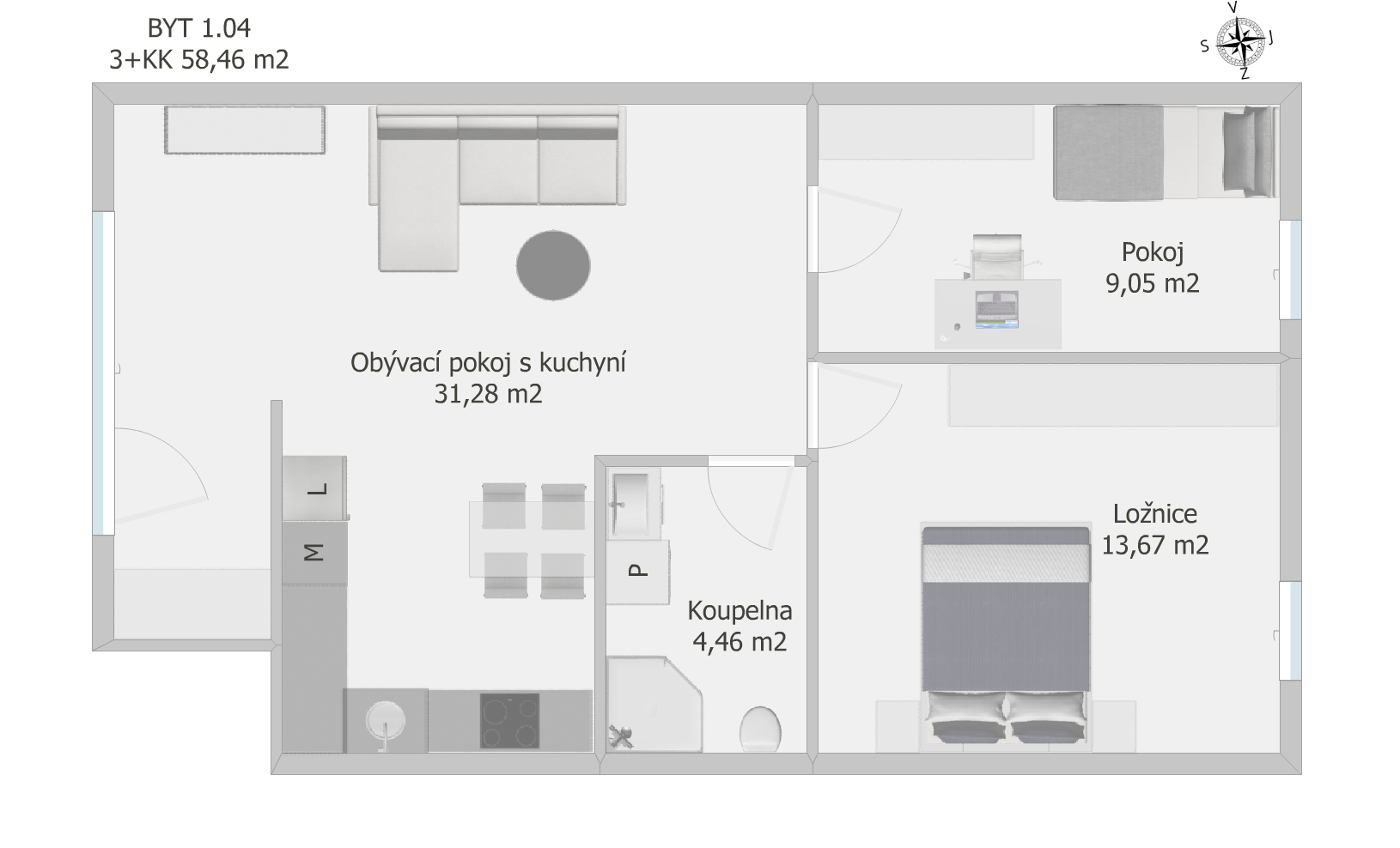 Nabízíme vám ke koupi byt 3+kk č. 1.04 o výměře 58,46 m² s vlastní verandou o velikosti 10,85 m², který vzniká v rámci nového rezidenčního projektu 14 bytů v Plzni – Božkově. Dokončení výstavby je plánováno na 4. čtvrtletí roku 2026.
